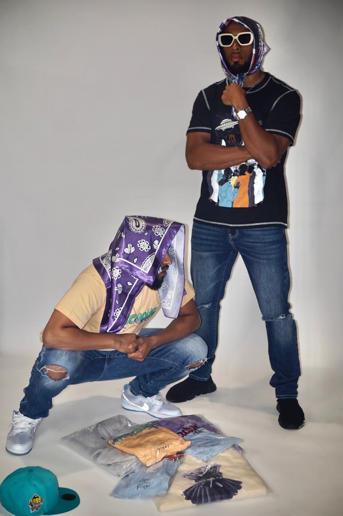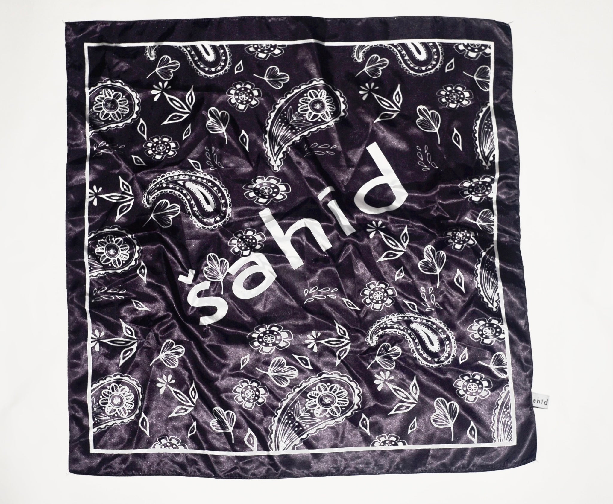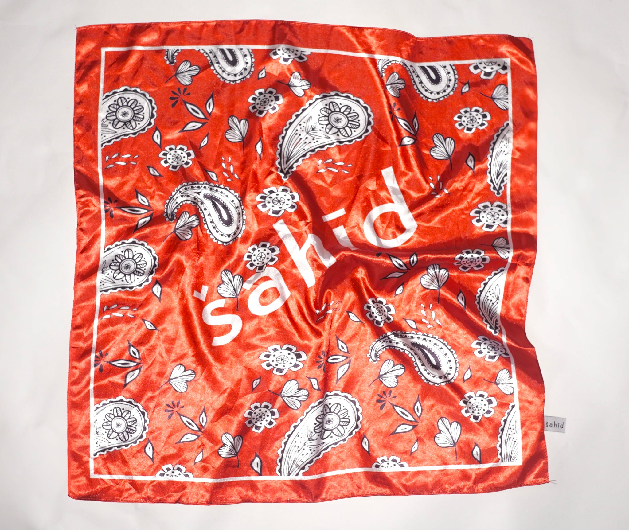 A branding-focused design, this šahid scarf is detailed with repeated hand drawn paisley motif and logo for finish